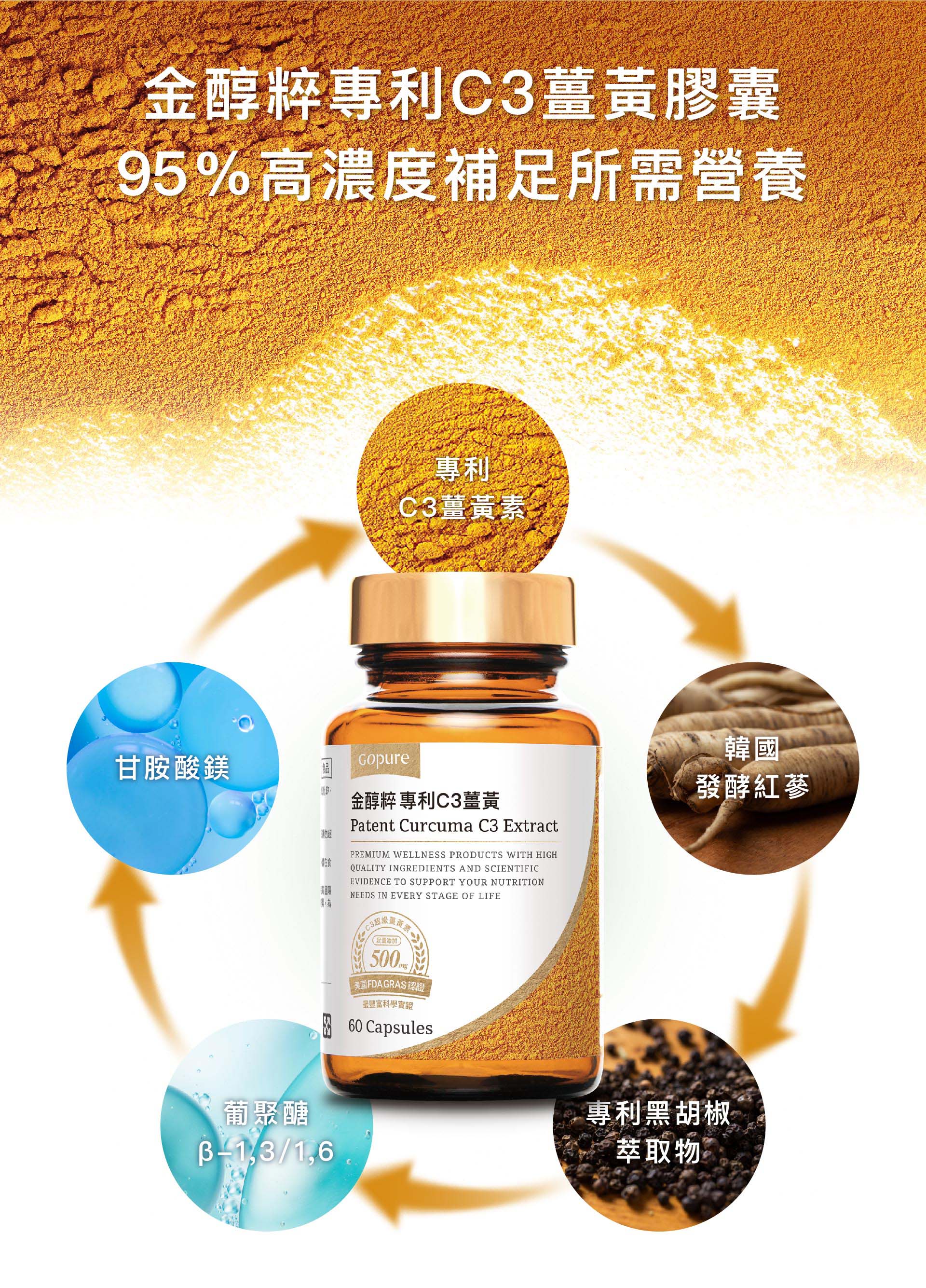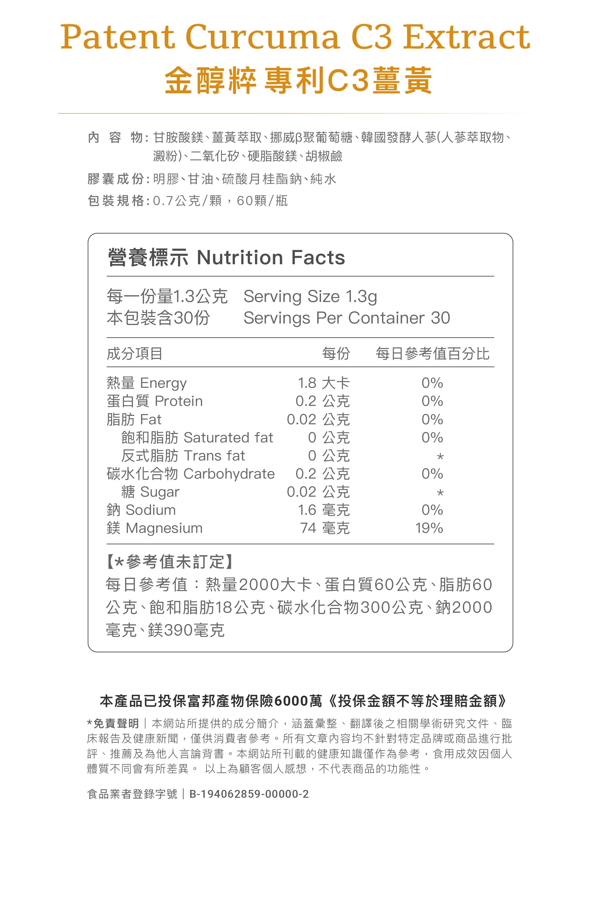 | 成分說明: 甘胺酸鎂、薑黃萃取、挪威β聚葡萄糖、韓國發酵人蔘(人蔘萃取物、澱粉)、二氧化矽、硬脂酸鎂、胡椒鹼 |
